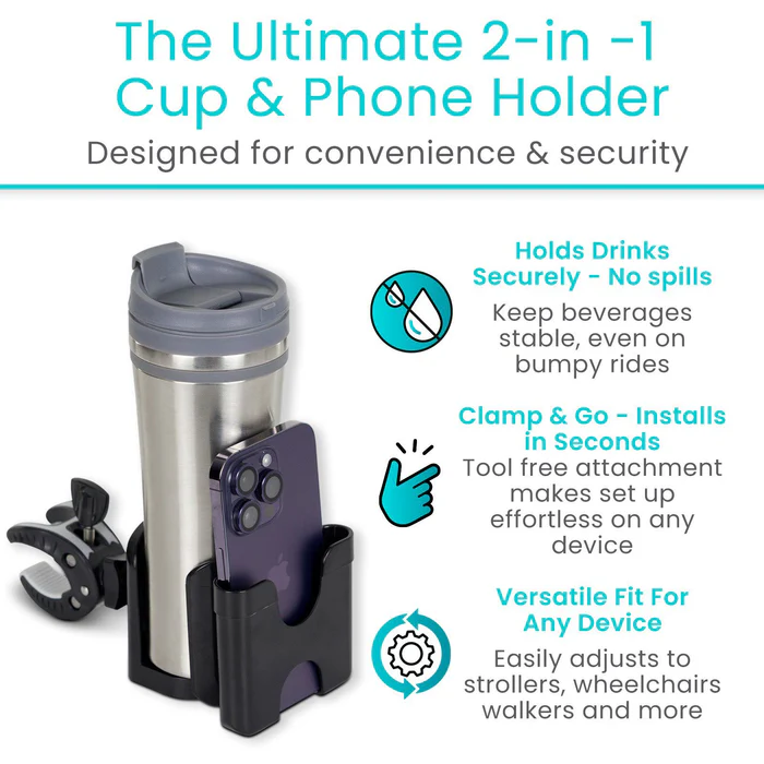 Designed for wheelchairs and mobility aids, this holder keeps cups, bottles, and phones accessible, offering added convenience for daily activities.