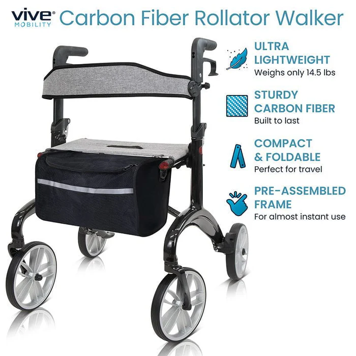 The Vive Carbon Fiber Rollator introduces a cutting-edge carbon fiber frame that combines unmatched strength with lightness, setting a new standard for mobility aids. At just 14.5 pounds, it offers the ultimate ease of portability without compromising on durability, making it a top choice for those who value support and convenience. Carbon fiber’s advantages over aluminum include its enhanced strength-to-weight ratio, providing exceptional support and longevity