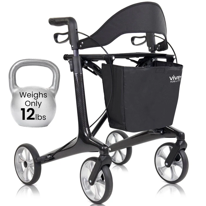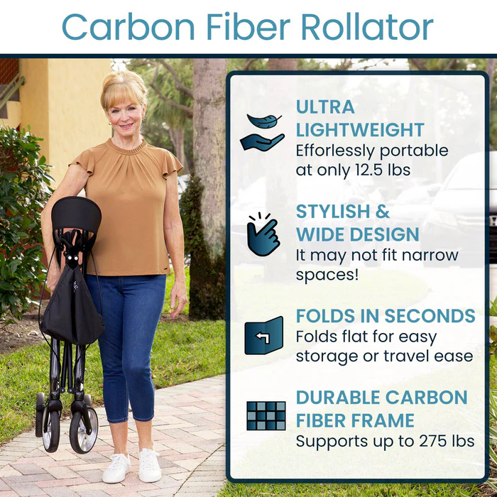 The sleek carbon fiber construction combines modern design with durability, delivering lightweight yet reliable support. This rollator is ideal for navigating both indoor spaces and outdoor surfaces with confidence.
