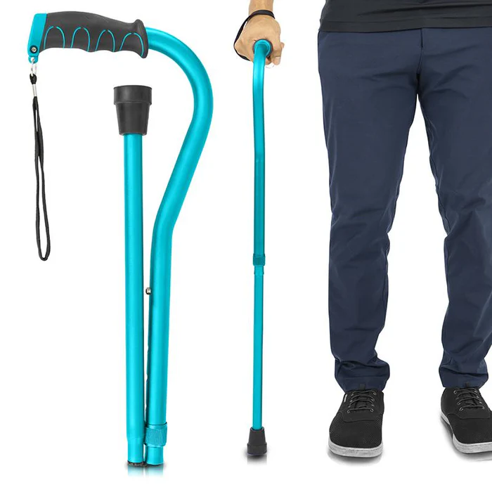 Sized to fit most adults, the folding offset cane adjusts from 32” to 37” with a secure locking ring and pushpin system