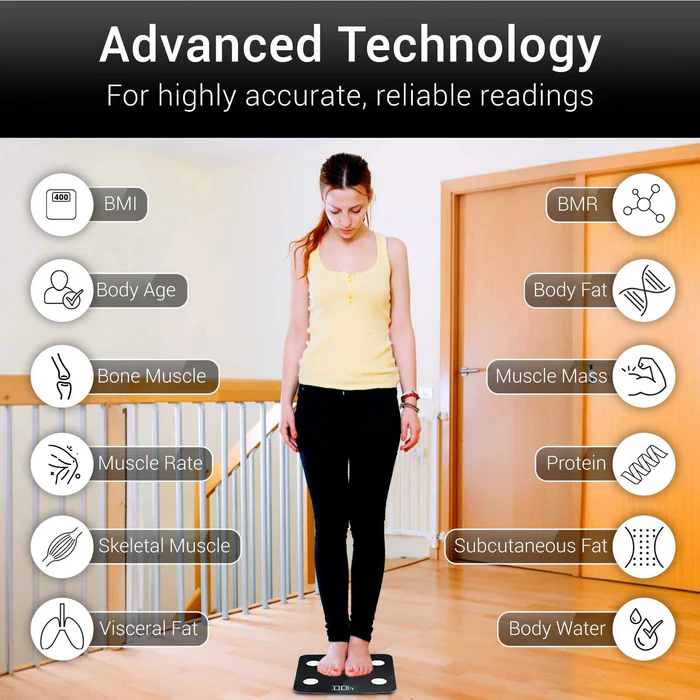 Accurately measures and records body weight, body fat, muscle mass, bone density, water weight, BMR and BMI to easily track weight and fitness goals