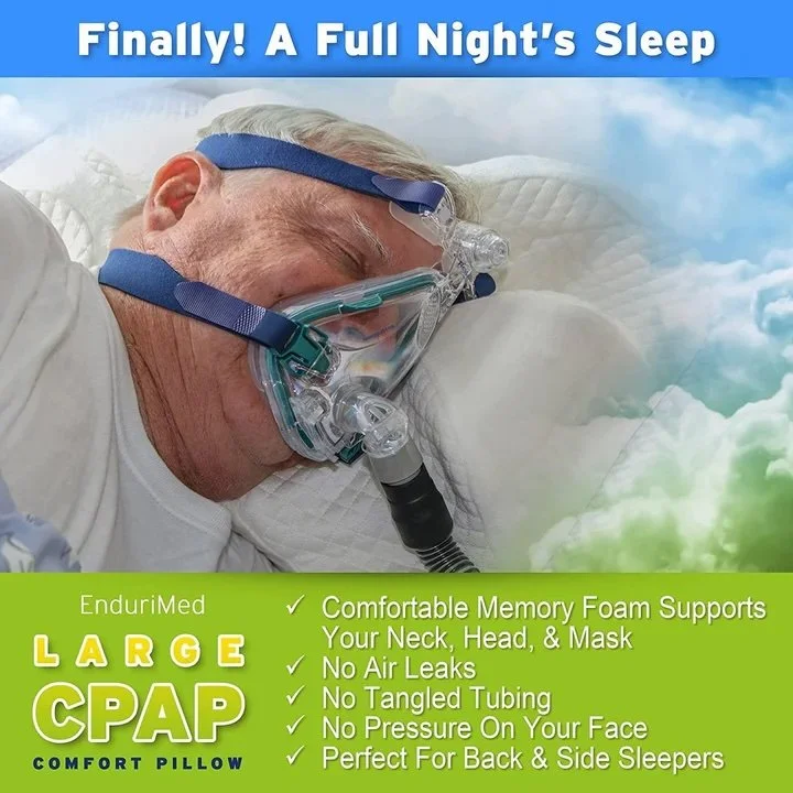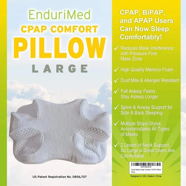 CPAP pillow by EnduriMed -- memory foam contour design reduces face and nasal mask pressure and air leaks and provides head and neck rests for maximum comfort for CPAP, BiPAP, and APAP users.