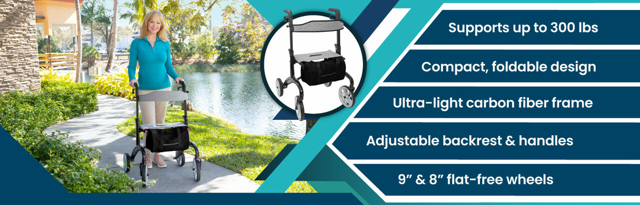 Engineered with a robust carbon fiber frame and a well-balanced design, this rollator offers exceptional stability on various terrains. Its durable construction safely supports up to 300 pounds, ensuring secure and steady support as you move confidently through your day. Its 9” front wheels and 8” rear wheels are flat-free and non-marking.Compact Folding Design For Easy Transports